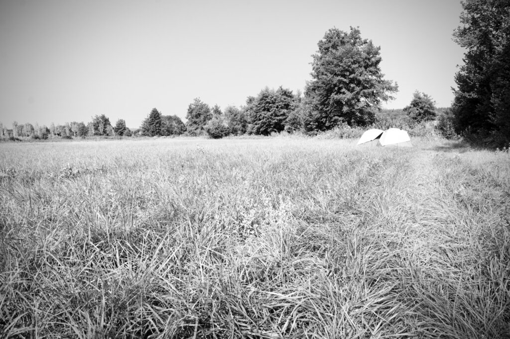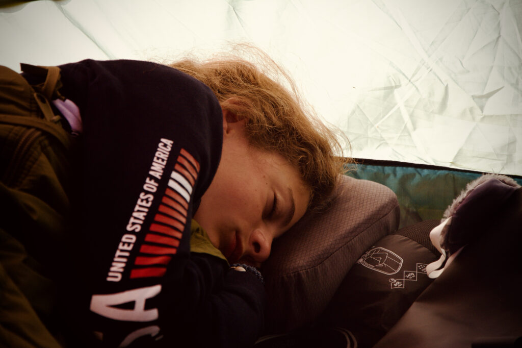 On a planté nos tentes dans le bois, à l’endroit le plus plat que nous avons trouvé, et on est tous prêts pour faire un gros dodo.