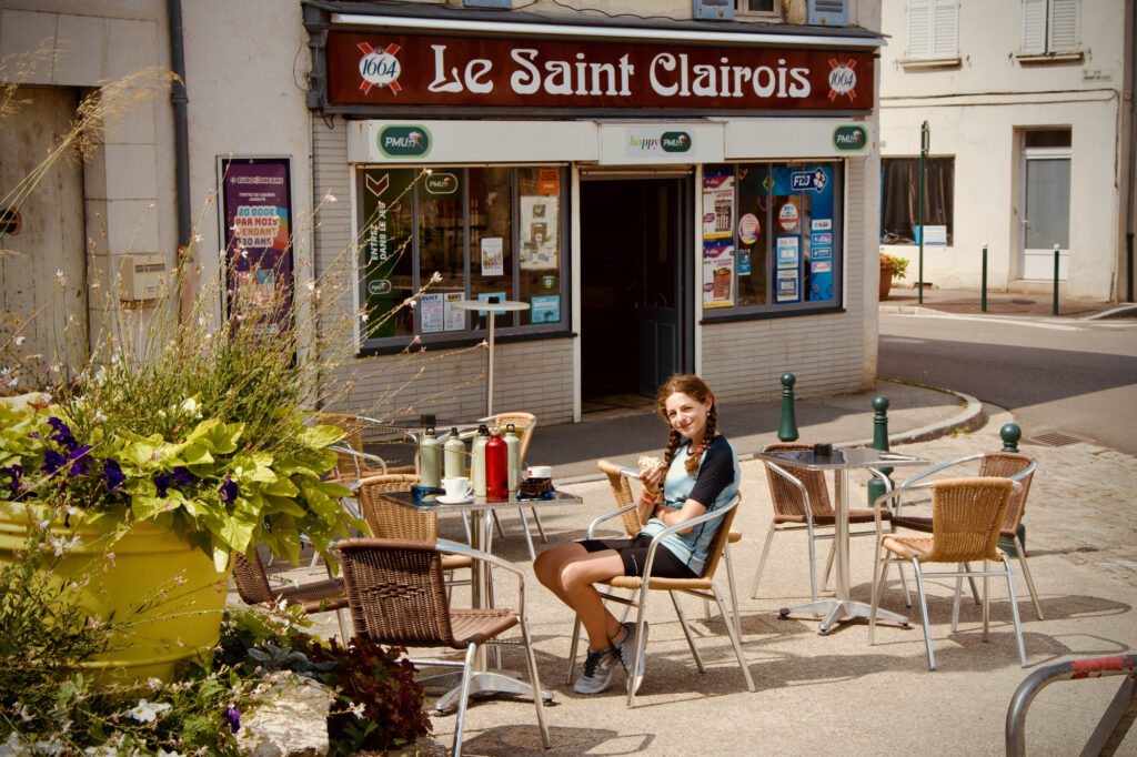 On s’est arrêtés une quinzaine de minutes plus tard à “Le Saint Clairois”, un petit bar où papa et moi avons pris un chocolat et un café. Et où j’ai été chargée de la mission d’aller chercher des croissants et des pains au chocolat à la petite supérette d’à côté. Spoiler : la mission a échoué, il n’y en avait pas. Donc, à la place, j’ai acheté des granola cookies (les préférés de papa). On les a mangés très vite et nous avons demandé au “barman”, qui était par ailleurs très gentil, de remplir nos gourdes. Il a dit oui sans problème et nous avons (enfin, papa a) entamé une conversation de plusieurs minutes sur ce qu’on allait faire, où il fallait dormir… ou pas, et de Montpellier.