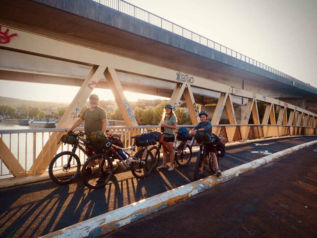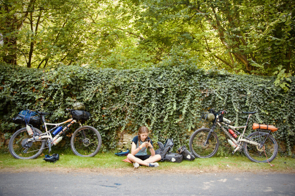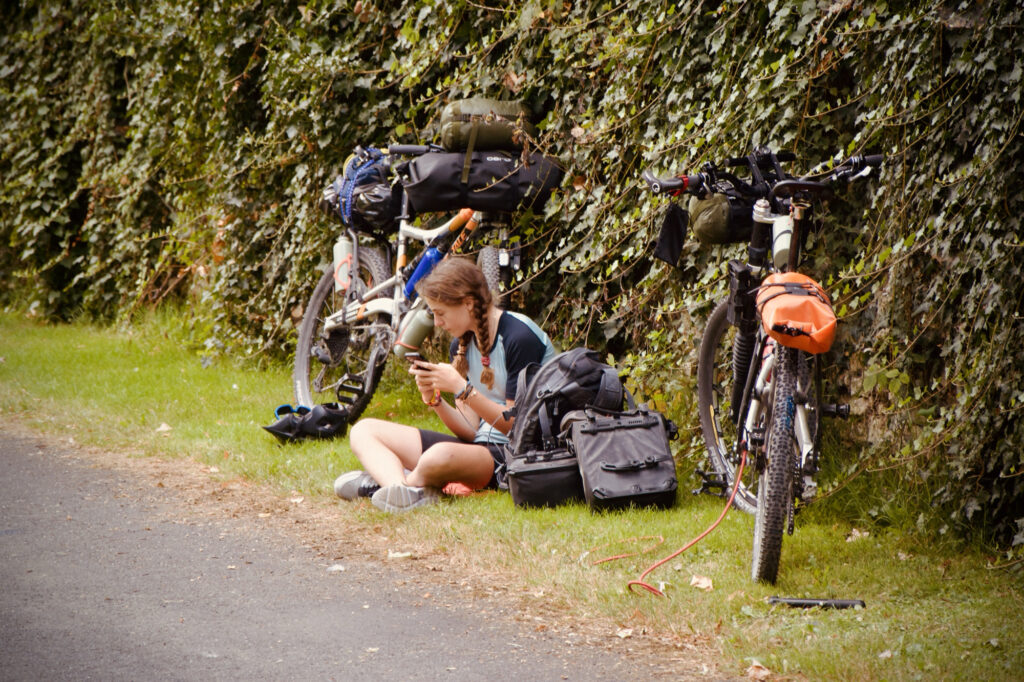Enfin bref, après cette pause, on a continué jusqu’à ce que papa crève son pneu sur une épine de rose. Vu la taille de l’épine, on a cru que le latex aurait bouché le trou sans problème, mais après 20 minutes de patience en attendant que le latex sèche, toujours rien. On a donc choisi la sage décision d’attendre Liv et Nils, car Nils avait les outils.