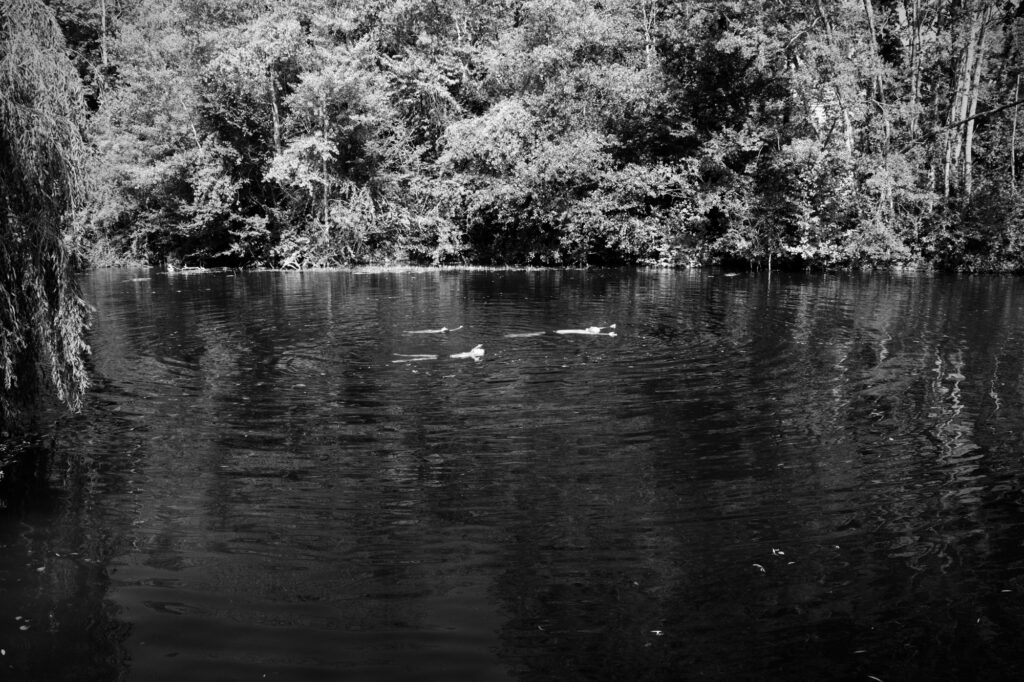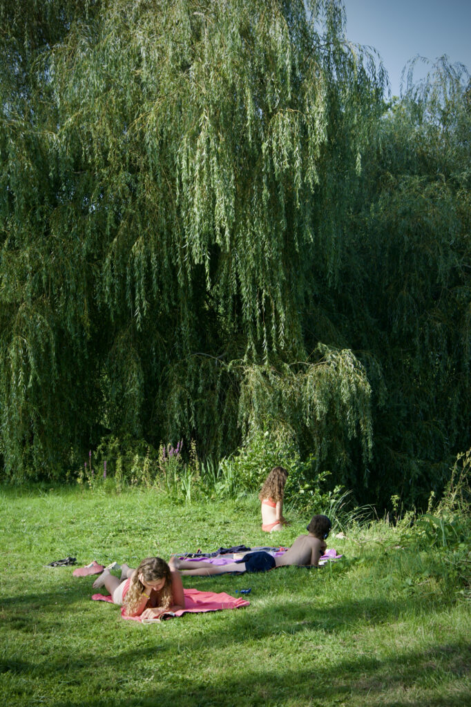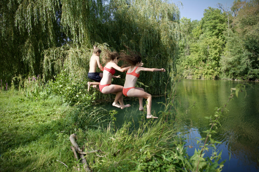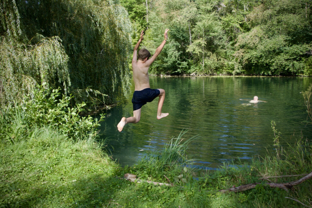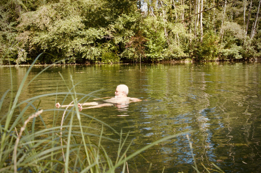 Après que Papa et moi avons réussi à nous caler (presque pour la journée), nous avons fait un plouf dans la rivière du Loing, en attendant Liv et Nils pour replonger. Au début, Papa et moi nous battions pour savoir lequel de nous deux allait devoir y aller en premier, car nous appréhendions le fond de cette rivière. Les bords étaient tout boueux, et la vue de celle-ci nous retenait un peu ; nos pieds s’enfonçaient dans la boue. De plus, on ne pouvait pas bien s’accrocher aux bords car il y avait des orties partout. Mais l’eau fraîche et profonde nous a finalement laissés aller. On s’est amusés quelques heures dans la rivière, puis nous avons filé à la douche, car nous n’étions pas sûrs de la propreté de l’eau.