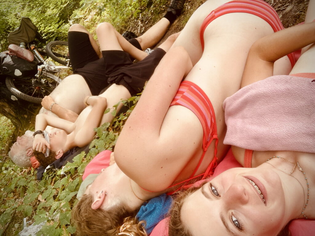 Notre déception fut immense, et nous nous dirigeâmes alors vers le bois, où nous comptions grandement sur la fraîcheur procurée par l’ombre des arbres. Sur le chemin, Papa creva, et le trou de la roue avant d’Anna s’ouvrit à nouveau. En arrivant, nous prîmes la belle décision de rester là pour l’heure qui suivit. Papa nous proposa de dormir, ce que nous fîmes en déposant nos serviettes par terre et en restant en maillot de bain, car il faisait très chaud. Je dormis facilement deux heures, Papa dormit une heure, et Anna et Nils ne purent fermer l’œil. Je peux dire avec affirmation que Papa gagne en créativité, car il m’a réveillée en me jetant des coquilles de noix, et je me réveillai alors en l’appelant, persuadée qu’un écureuil me voulait du mal.