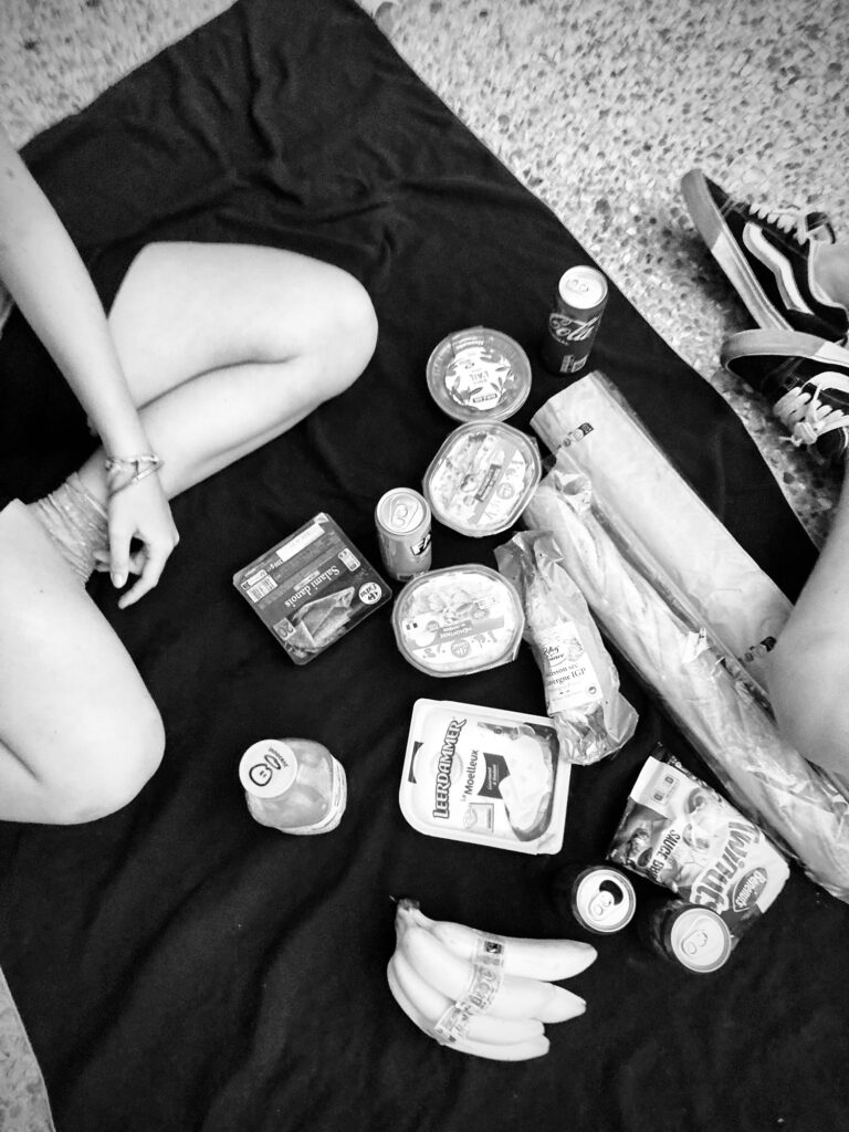 En sortant, il pleuvait des cordes, des chiens et des chats, et Papa ne connaît pas l’expression néerlandaise. Donc, nous avons mis le très lourd sac de courses sur le guidon d’Anna et avons bravé la pluie pour atteindre Papa et Nils, à Intersport. Ici, nous avons mangé notre festin, composé par ma personne, constitué de : trois canettes de Coca et une de Fanta, des Benenuts, des olives à l’ail et au persil, des bananes, une salade piémontaise et une salade tortis-surimi (la même que j’ai mangée à midi, vous vous rappelez ?), du salami, du Leerdammer, un jus Innocent orange-carotte et deux baguettes. Nous l’avons dégusté, installés sur la serviette de Nils, qui porte maintenant les traces de notre repas, avec Mbappé qui nous regardait fixement depuis son poster sur l’Intersport. La pluie était battante et nous observions avec fascination.