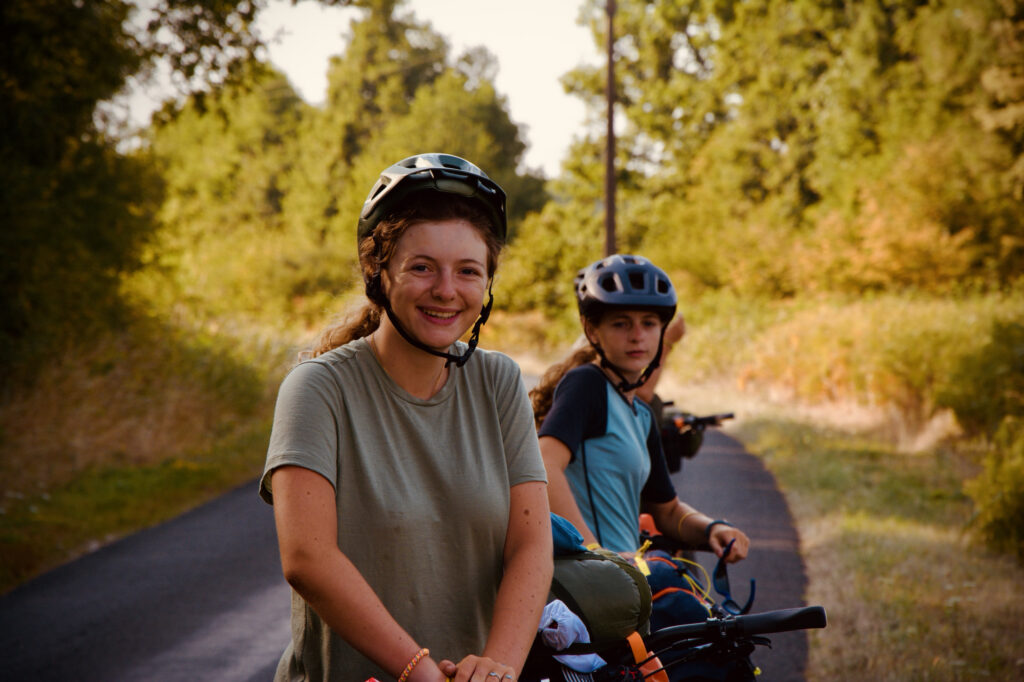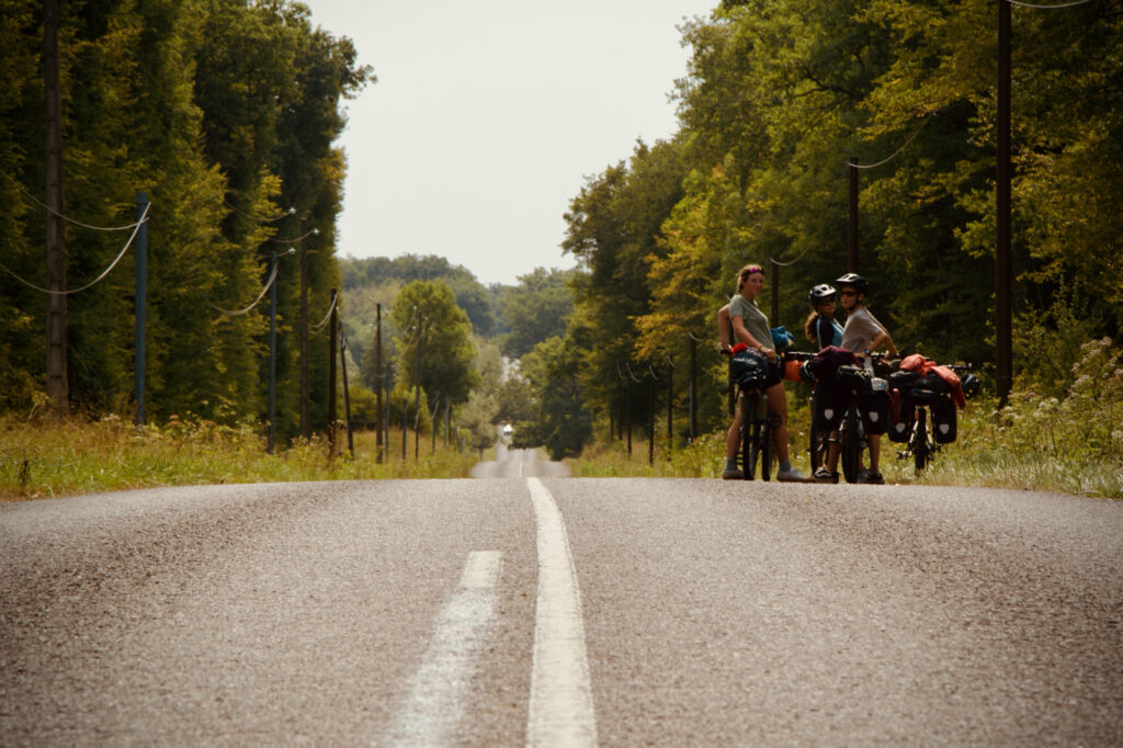 Puis, nous nous sommes remis en route pour nos 20 km restants, cherchant un campement. Nous sommes passés par un chemin en haut d’une colline, large d’un mètre, avec de raides et longues pentes de chaque côté. Papa a failli tomber, et le pain qu’Anna avait mis sous son sac s’est fait la malle ; Nils l’a rattrapé à temps. Nous sommes aussi passés par des endroits où les vélos étaient très mal accueillis : de petites structures en bois, en angle droit, laissaient passer un humain… et sa capacité de virage. Pas un vélo. Ainsi, nos vélos découvrirent les joies du “une roue”, position humain-verticale.