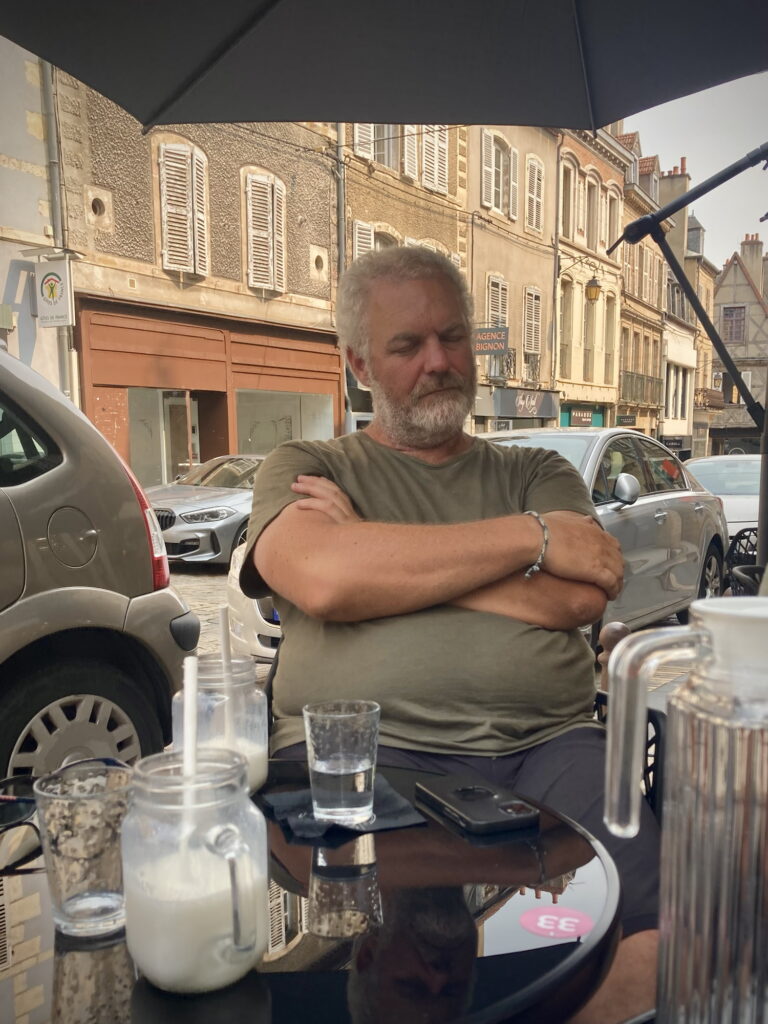 Nous avions fait 8 km avant d’arriver dans un petit village, et avons aperçu un bar où nous voulions nous installer. En rentrant, Papa demande si le bar est ouvert, et le gérant lui répond fort mal aimablement : « Si tu as pu rentrer, alors c’est qu’il est ouvert. » Papa, mécontent, s’assoit dehors et nous dit que si le mec ne vient pas prendre notre commande dans 5 minutes, alors on part. Finalement, en regardant la carte, nous nous rendons compte que l’Intermarché est juste à côté. Ni une ni deux, on part, et nous nous retrouvons cinq minutes plus tard dans le magasin.