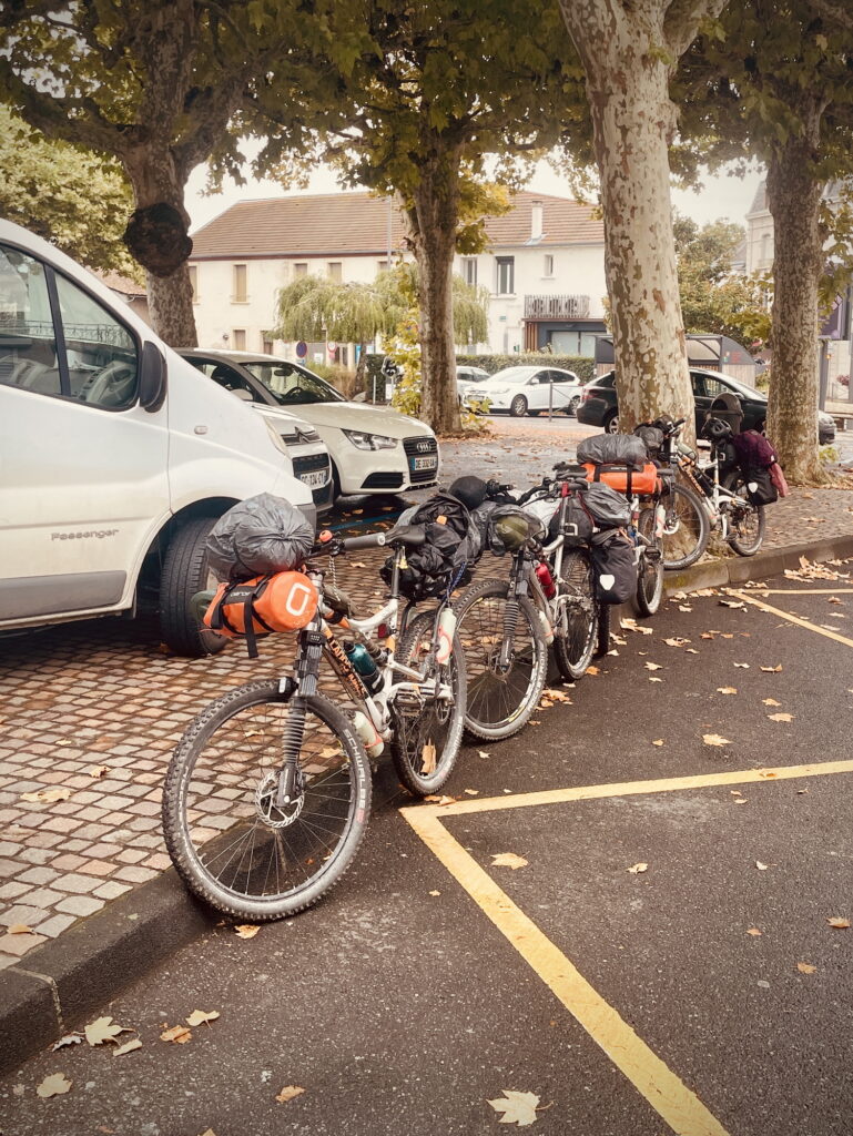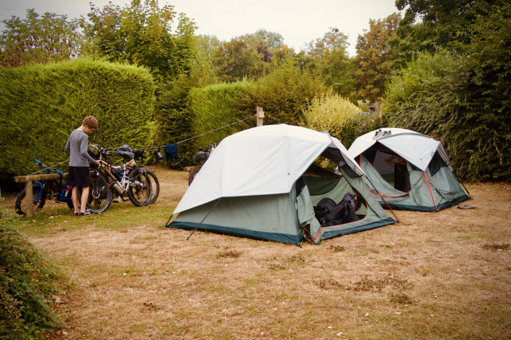Vers 9h (7h pour Papa), après un réveil paniqué causé par l’association du doux bruit de la pluie sur la tente et de nos vêtements, étendus délicatement sur un fil, nous accourûmes pour les récupérer et commençâmes à ranger nos affaires dans nos sacs, à l’abri sous la tente. Papa, qui avait déjà tout fait, était parti boire un café. Une heure plus tard, nous avions rangé nos affaires et nos tentes. Il nous fallut une demi-heure pour remplir nos gourdes, attacher les sacs enveloppés de sacs-poubelle aux vélos, mettre nos ponchos et finalement partir sous la pluie.