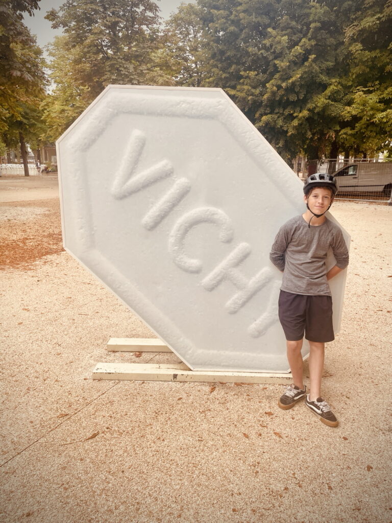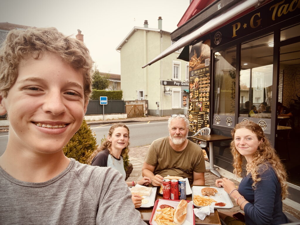 Puis, nous dûmes repartir, sous la pluie, ce qui fut douloureux car nous avions froid, même après avoir été réchauffés par un bon repas et de bonnes boissons. En route, on vit de belles boutiques, une galerie dans le parc magnifique, et de gentilles personnes. Après avoir vu la statue de la fameuse pastille, on quitta Vichy et prit la vélo-route “Via Allier”, suivant l’Allier : la V70 donc. Pendant 30 km, on roula, jusqu’à arriver à Puy-Guillaume, où nous avons mangé respectivement un sandwich, un tacos, un panini et un burger. Nous avons aussi acheté de quoi manger demain matin-midi, car Papa prédit qu’on ne trouvera rien avant un bon moment.