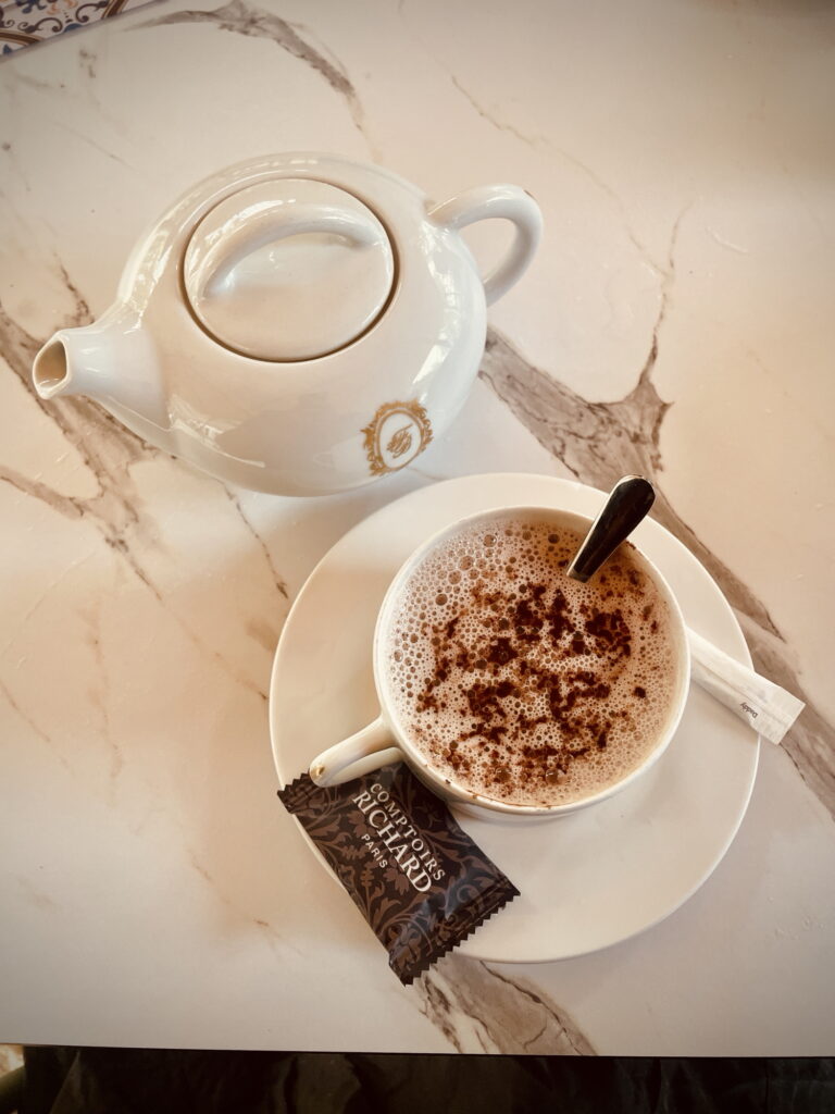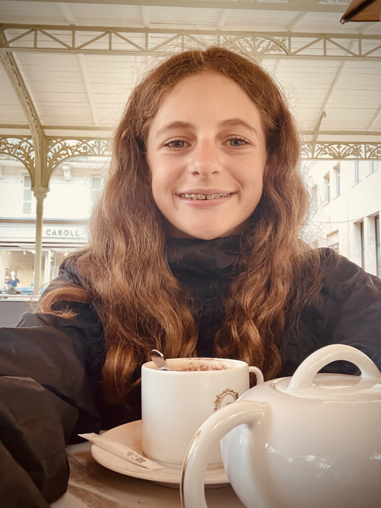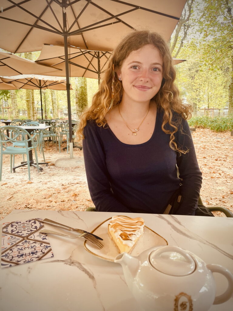 Nils et lui mangeaient déjà, et Papa nous commanda notre repas aussi. On en profita pour éclaircir ce qui s’était passé plus tôt : après avoir raccroché, Papa avait attendu 10 min, puis avait envoyé Nils nous chercher, qui rentra bredouille, car nous étions déjà parties. Nous nous sommes tous régalés, et avons pris : pour Papa, deux cafés et une salade parisienne ; Anna, une limonade avec un chocolat chaud et une salade césar ; Nils, un burger poulet-avocat et un coca avec une tarte au citron meringuée ; et moi, une salade césar et un thé noir russe aux agrumes avec une tarte au citron meringuée.