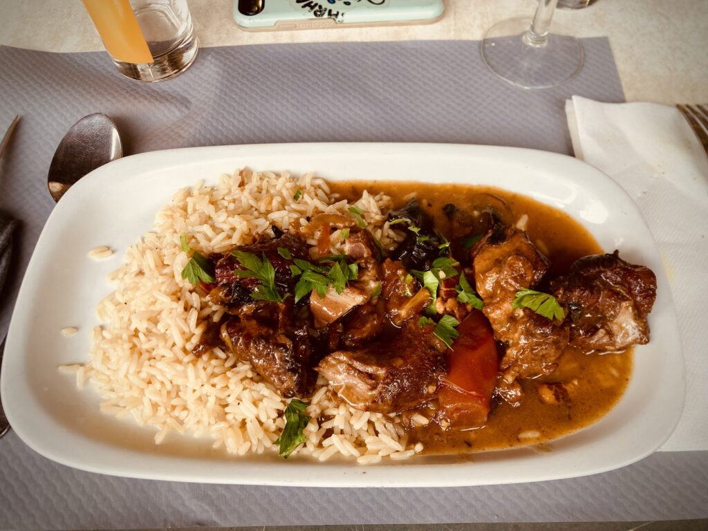 Même pas après 10 km, nous sommes arrivés dans un petit village où nous avons trouvé un restaurant – “L’Auberge du Tilleul” – très convivial (même un peu trop convivial à mon goût), où nous avons mangé une formule du jour qui se composait d’un sauté de veau en entrée, un marengo accompagné de riz et une tarte aux pommes délicieuse en dessert.