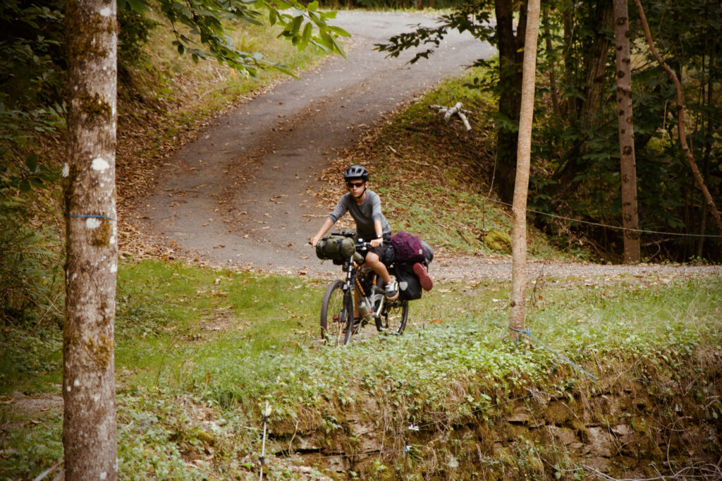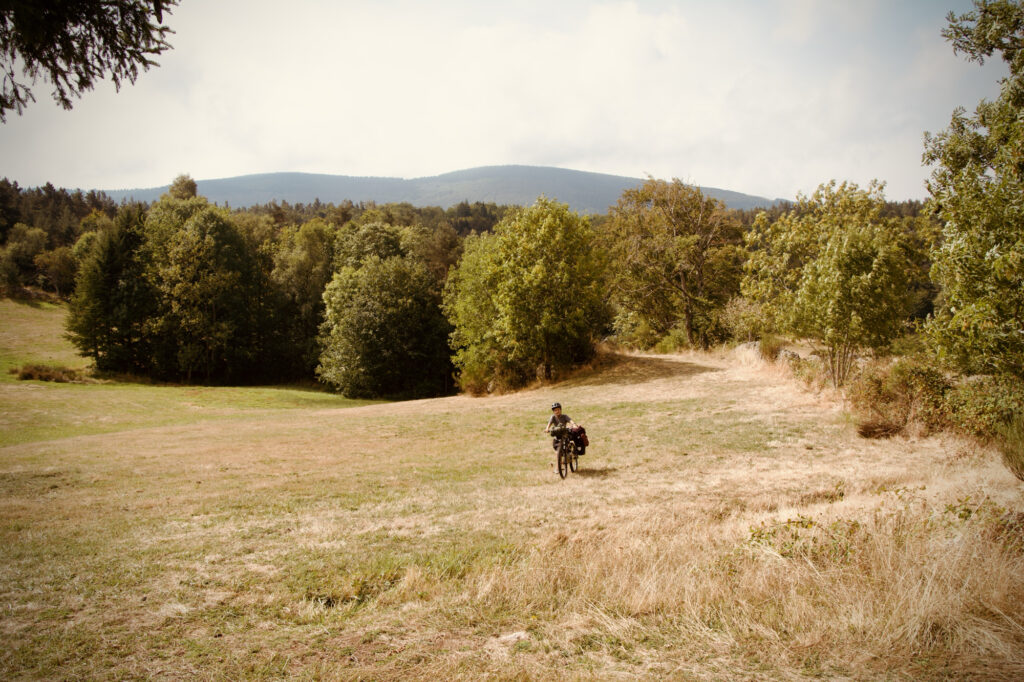 Ensuite, on roule jusqu’à un champ parfait pour planter nos tentes. Le coin était un peu risqué (visible depuis la route, la gendarmerie pas loin), mais l’endroit était frais, plat et paisible. On l’a choisi — et tant pis pour les patrouilles, on avait la qualité lumière coucher de soleil en prime.