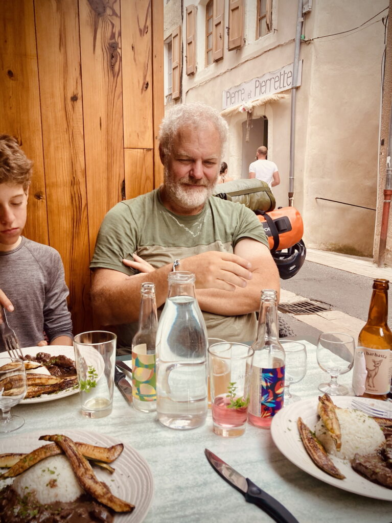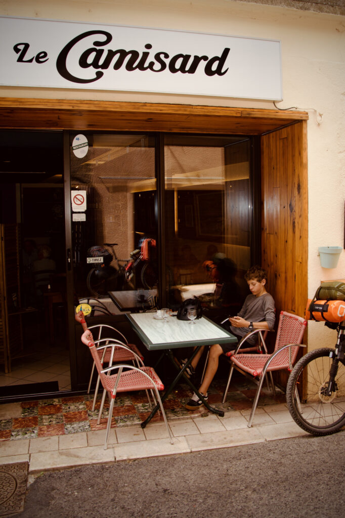 Arrivés à Florac, on cherche un resto. On opte pour “Le Camisard”. Et là, quel bonheur : du bœuf braisé, du riz, des courgettes en lamelles — tendre, réconfortant. Et pour finir en beauté : du pain perdu avec une boule de glace et du caramel… un vrai festival de douceur.