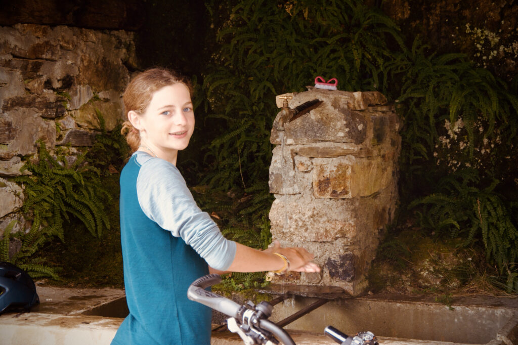 Nous étions en route depuis un peu plus d’une heure quand nous sommes tombés sur une source, sans aucun panneau indiquant si l’eau était potable ou non. À nos propres risques, nous avons rempli nos gourdes après que Papa a goûté l’eau (jugée bonne) et qu’il nous a dit que, pendant 4 ans, en Écosse, il avait bu l’eau de pluie. Fiers de notre trouvaille, nous avons repris la route, aisément.